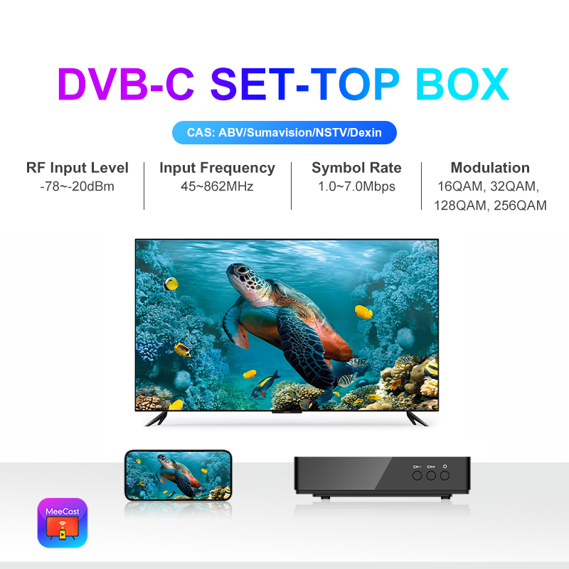 DVB-C, CAS(ABV, Sumavision, NSTV, Dexing), HD, MeeCast, USB PVR, EPG, USB Wi-Fi, IPTV, Youtube, MeeTube, Tiktok, Aktualizacja online
