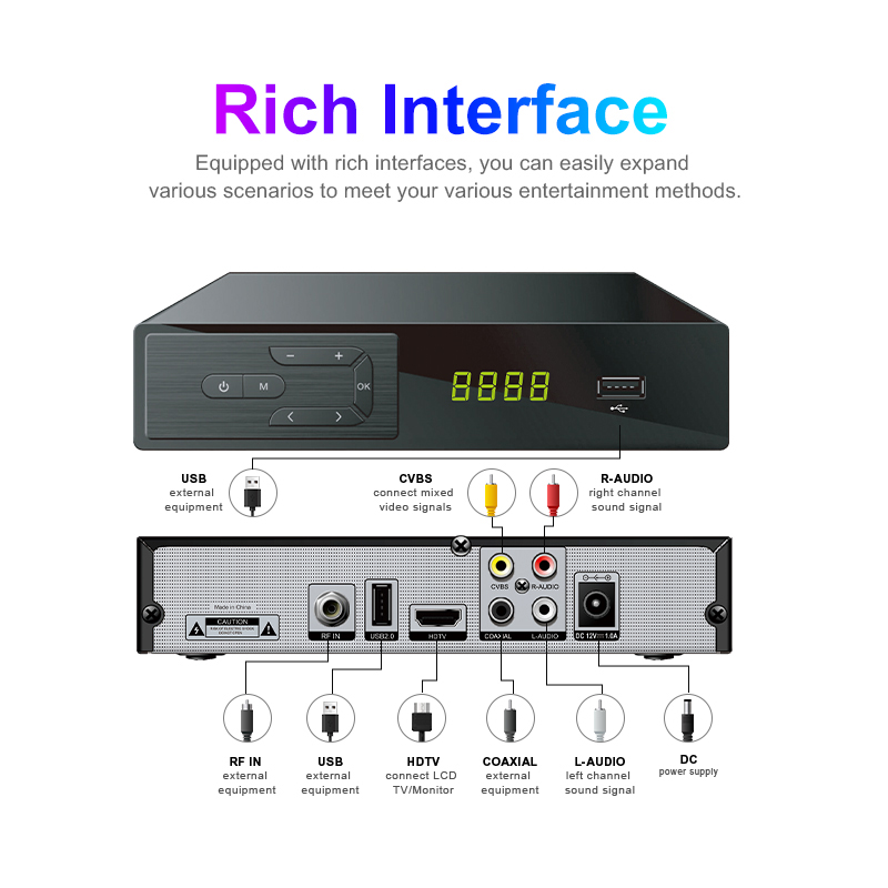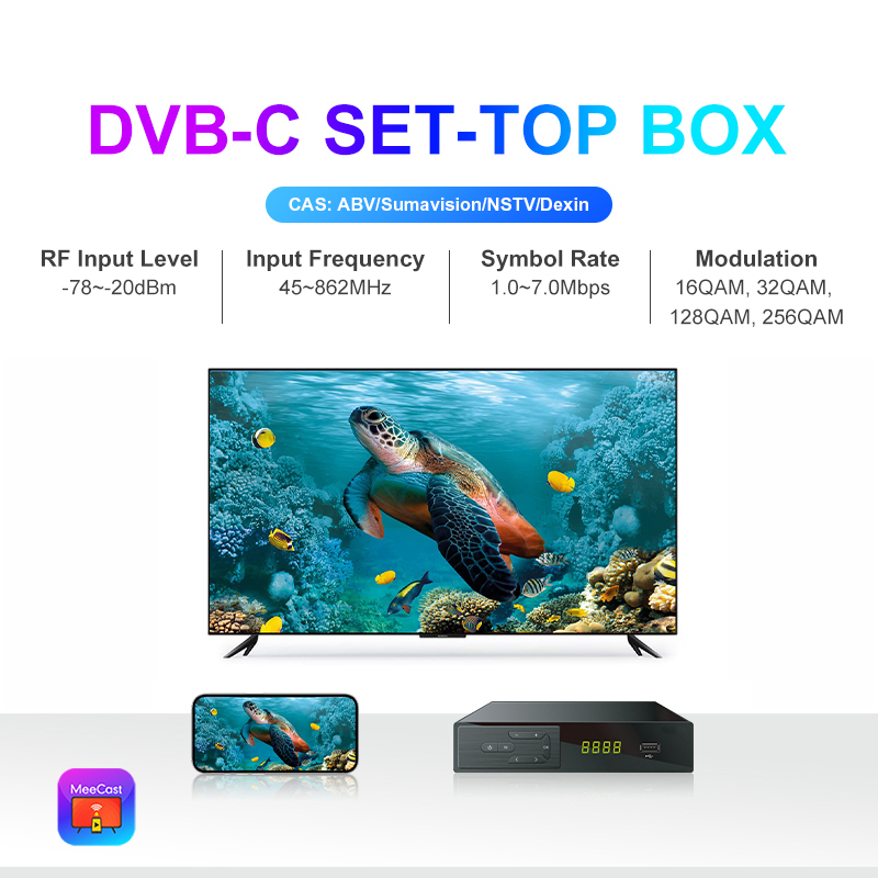 DVB-C, CAS(ABV, Sumavision, NSTV, Dexing), HD, MeeCast, USB PVR, EPG, USB Wi-Fi, IPTV, Youtube, MeeTube, Tiktok, Aktualizacja online |