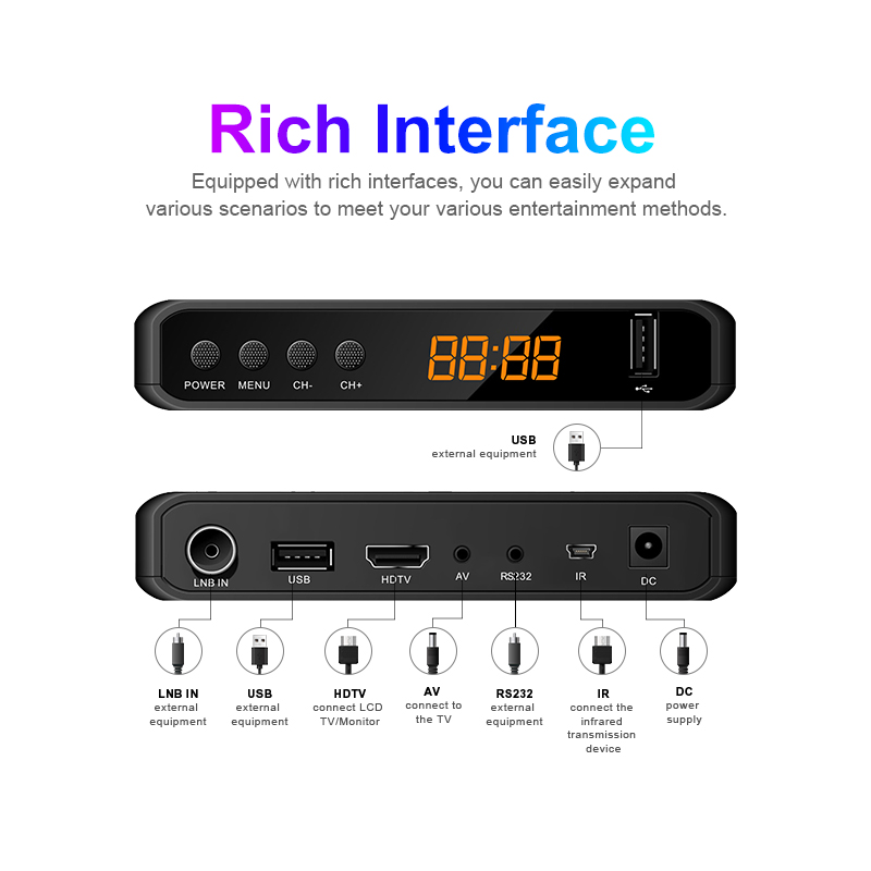 DVB-S2/S2X, FTA, HD, MeeCast, USB PVR, EPG, USB Wi-Fi, IPTV, Youtube, MeeTube, Tiktok, Aktualizacja online, CAS opcjonalnie |