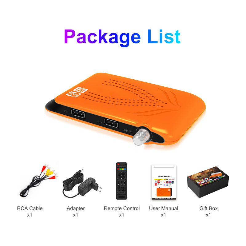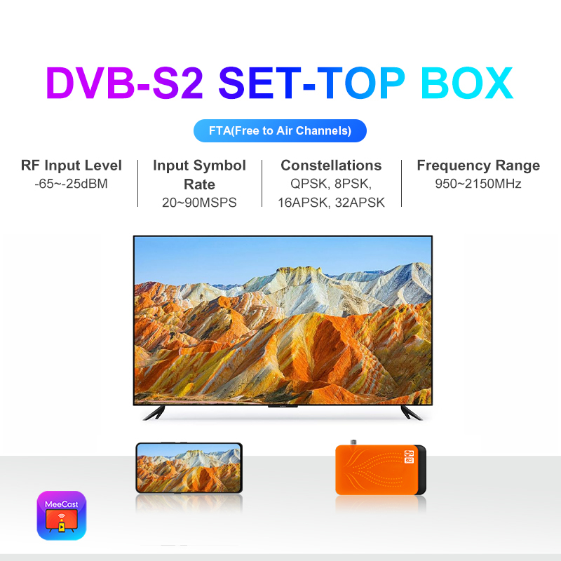 DVB-S2/S2X, FTA, HD, MeeCast, USB PVR, EPG, USB Wi-Fi, IPTV, Youtube, MeeTube, Tiktok, Aktualizacja online, opcjonalny CAS, specjalny pilot zdalnego sterowania z pełną funkcją. |