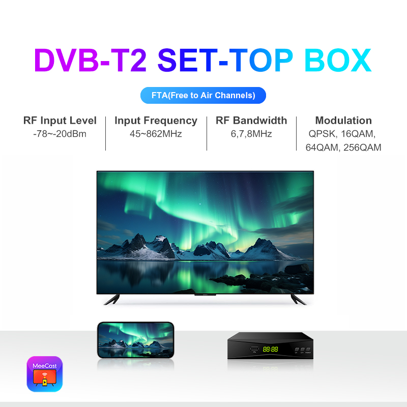 DVB-T2, FTA, HD, MeeCast, USB PVR, EPG, USB Wi-Fi, IPTV, Youtube, MeeTube, Tiktok, Aktualizacja online