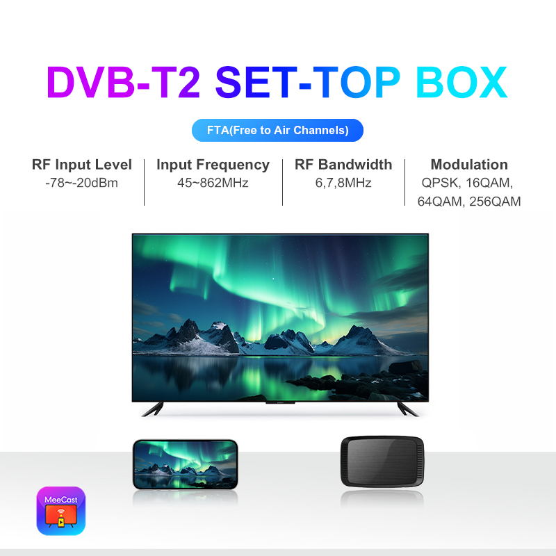 DVB-T2, FTA, HD, MeeCast, USB PVR, EPG, USB Wi-Fi, IPTV, Youtube, MeeTube, Tiktok, Aktualizacja online