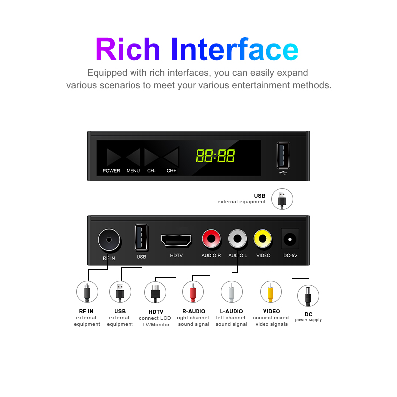 DVB-T2, FTA, HD, MeeCast, USB PVR, EPG, USB Wi-Fi, IPTV, Youtube, MeeTube, Tiktok, Aktualizacja online