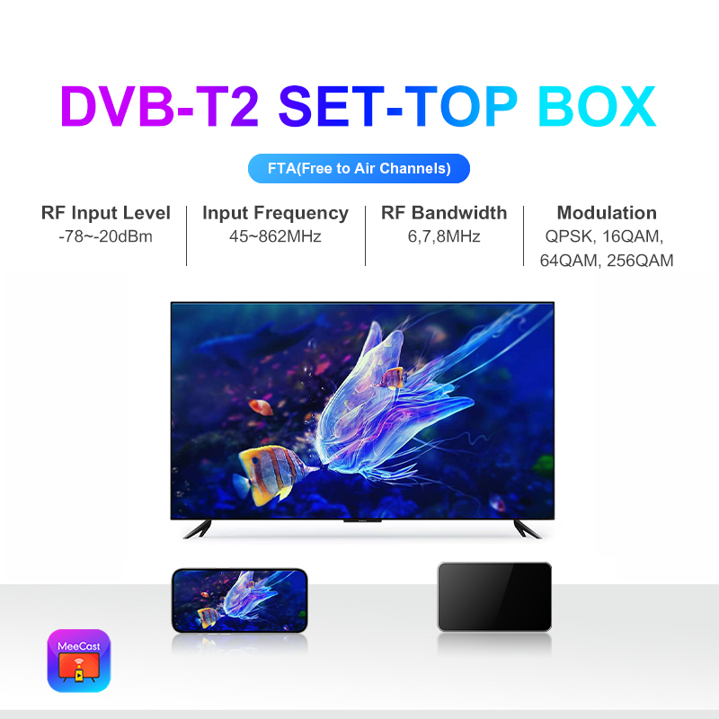 DVB-T2, FTA, HD, MeeCast, USB PVR, EPG, USB Wi-Fi, IPTV, Youtube, MeeTube, Tiktok, Aktualizacja online