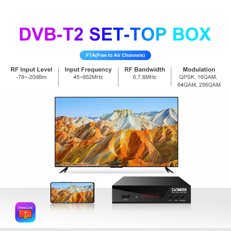DVB-T2, FTA, HD, HEVC, H.265, MeeCast, USB PVR, EPG, USB Wi-Fi, IPTV, Youtube, MeeTube, Tiktok, Онлине ажурирање |